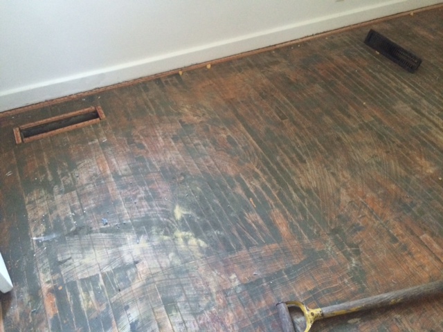 The good news is that the doors now swing freely. The bad news is the floor. The contractor’s best guess was that someone once glued an indoor/outdoor carpet on the floor, because hey, why not?
