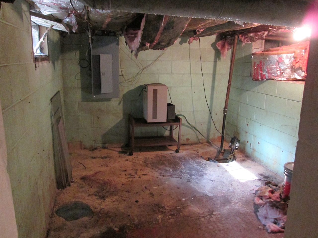 The back room. The pink carpet was so old that I think it was put there before the house was built. The ad had said “wood floors under carpets”, which is true, if you count a subfloor. (Note: We found this out before we made an offer, so it wasn’t a surprise. Extra note: this is the room the mystery noise came from, so also pictured is the ghost.)